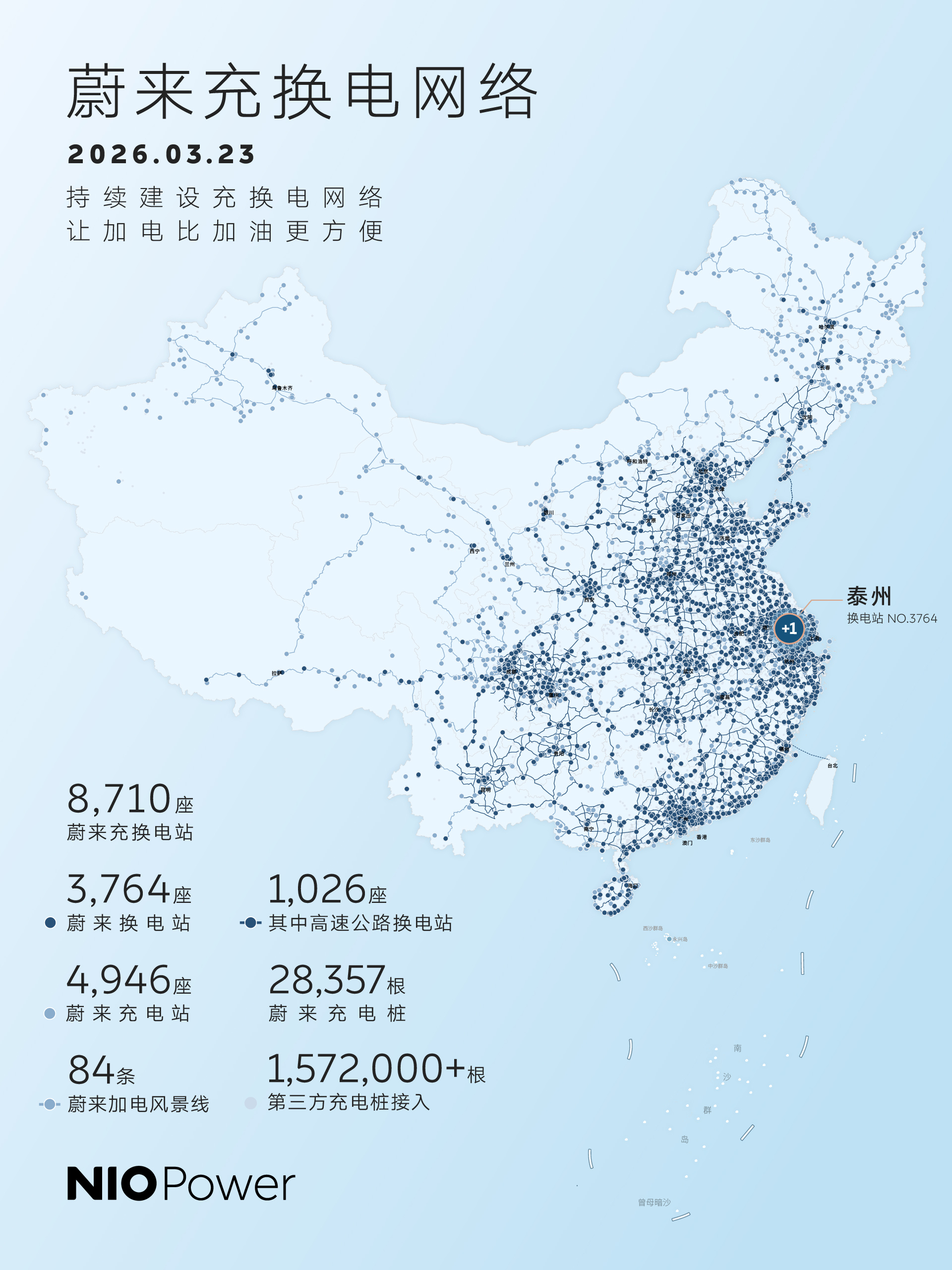 蔚来:NIO Power 1站上线:蔚来全国充换电站突破8710座,换电服务再升级