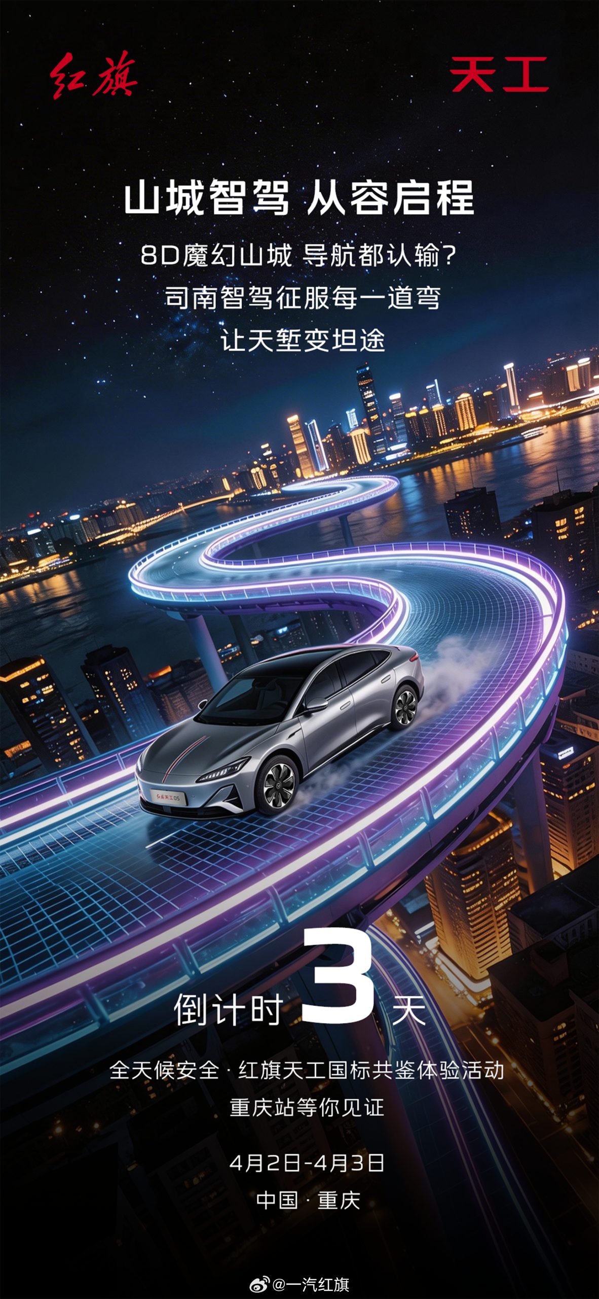 一汽红旗:红旗天工司南智驾挑战8D魔幻山城,全天候安全体验活动盛大开启!