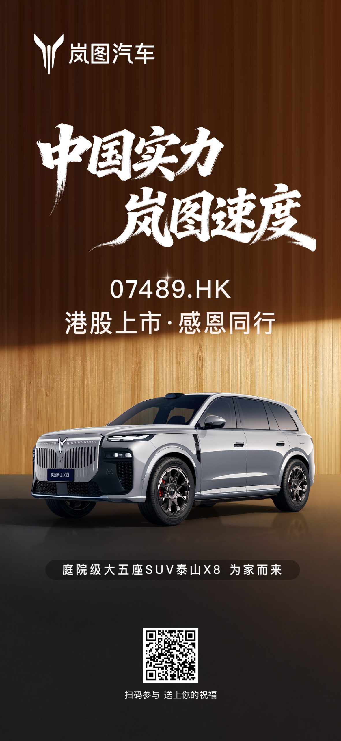 今日 #岚图汽车#正式登陆港股! 成为“央国企高端新能源汽车第一股” 股票代码 07489.HK 岚图汽车赴港上市的首发战略车型 ——岚图泰山X8同步亮相