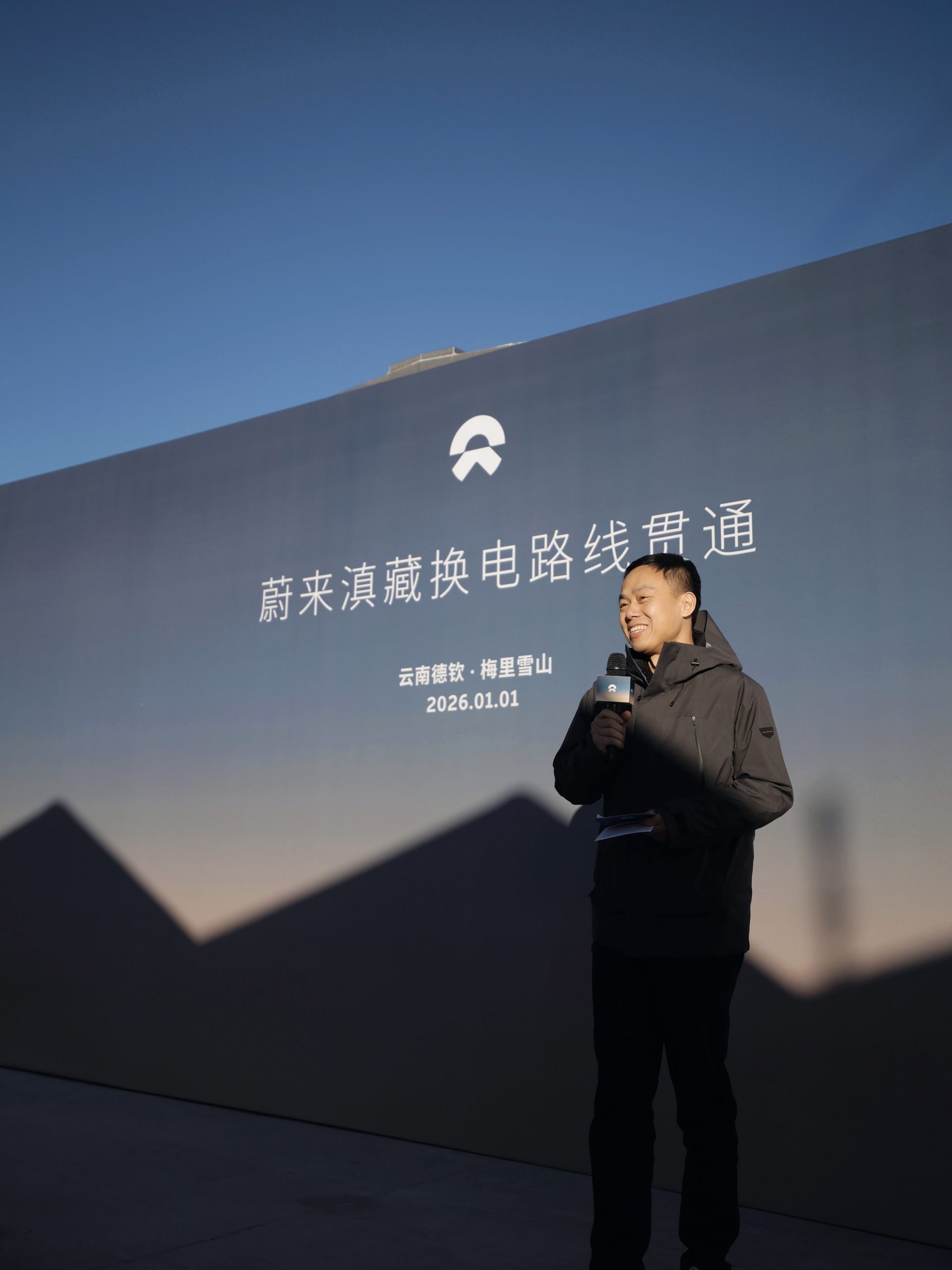 2026年1月1日,随着德钦梅里雪山蔚来换电站正式上线,蔚来滇藏换电路线实现全线贯通。当天,蔚来创始人、董事长、CEO李斌与蔚来高级副总裁、乐道汽车总裁沈斐驾驶乐道L90,从云南昆明全程换电抵达德钦梅里雪山,完成对该路线的实地验收。