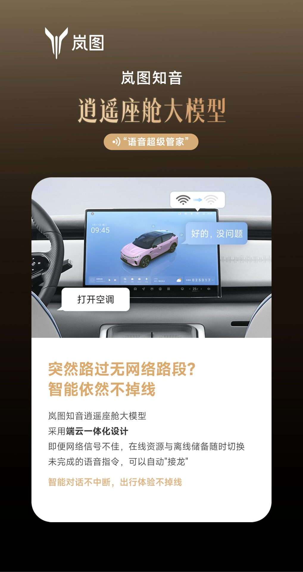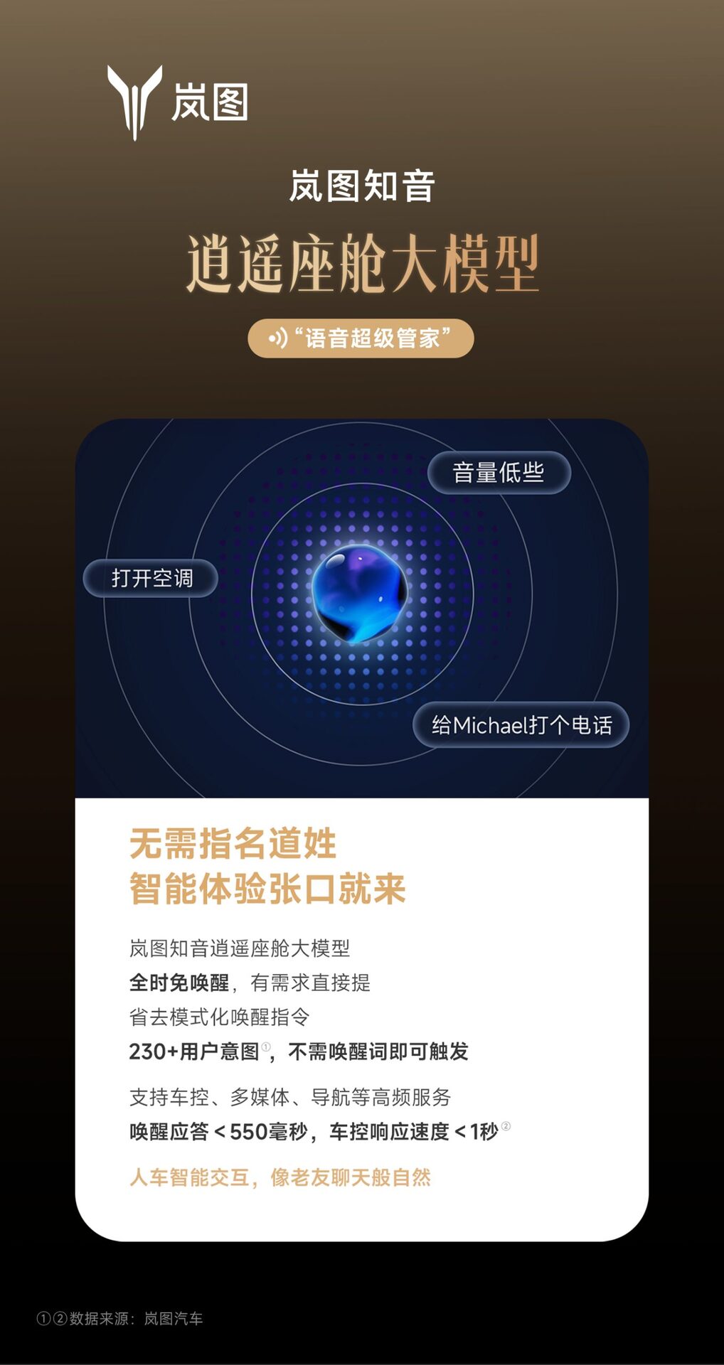 智能新境界,对话新未来 #岚图知音# 语音超级管家 时时在线,对话不中断 瞬时响应,自然免唤醒 精准理解,AI大模型加持 全屏热词,可见即可说 助你开启全新“声控”智能体验