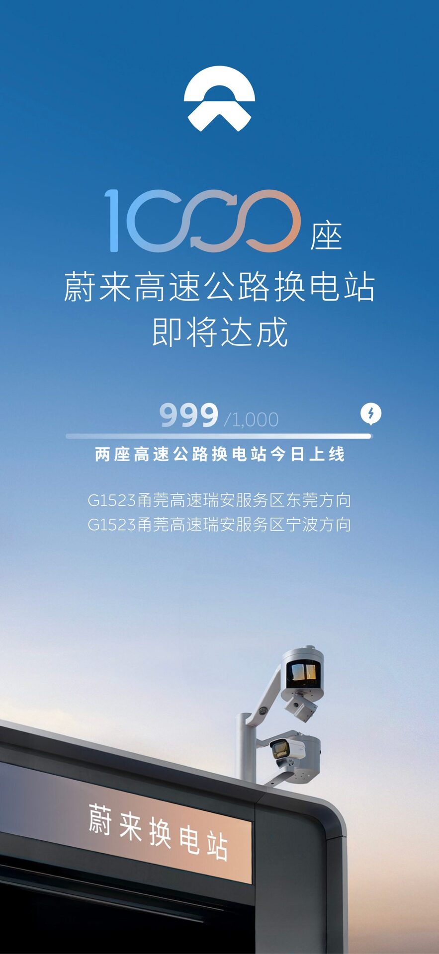 蔚来高速1,000站达成倒计时1天!第998、999座高速公路换电站于G1523甬莞高速瑞安服务区正式上线。蔚来完成全国主要城市间高速公路换电网络建设,连通全国550城,蔚来和乐道用户高速公路补能焦虑宣告终结。