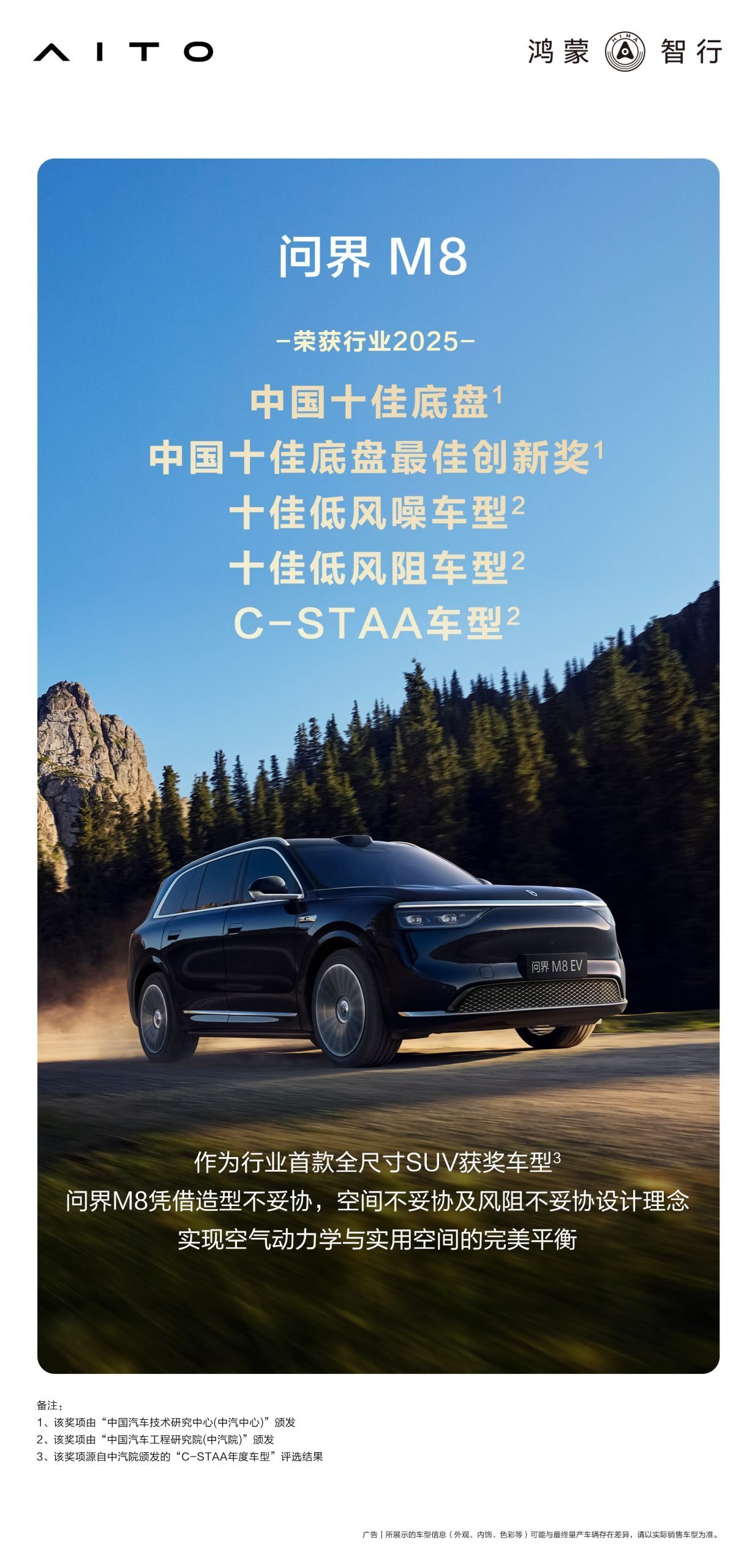 #问界M8# 斩获2025年 “中国十佳底盘” “中国十佳底盘最佳创新奖” “十佳低风噪车型” “十佳低风阻车型” 及 “C-STAA车型” 5项大奖,硬核素质铸就全能实力。这个假期,开上问界M8,自在驰骋山河!http://t.cn/A61FKKVy