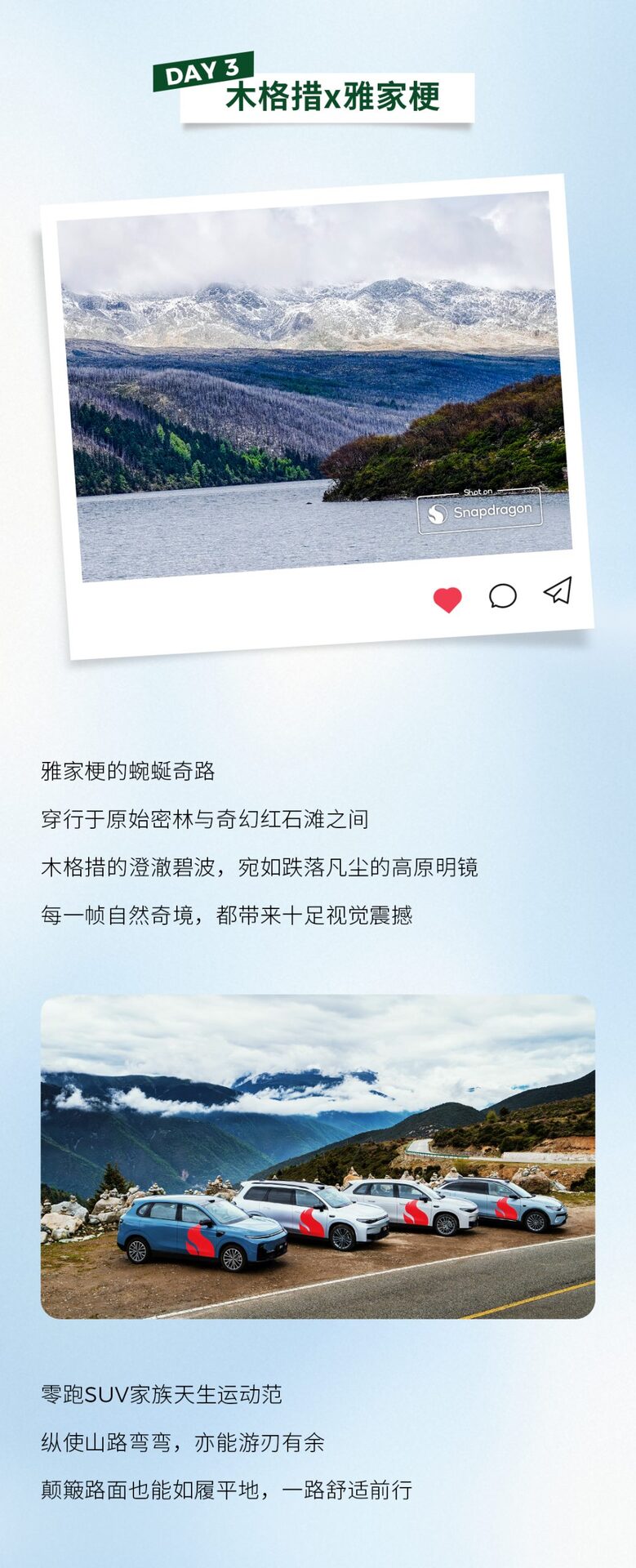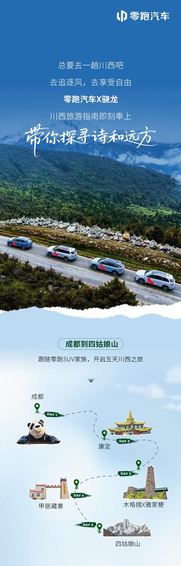想解锁川西?旅游指南即刻奉上 零跑SUV家族带队 从成都🌆 到川西🏔 5天追风🏞 探景🚗 享自由 智能+性能 buff 叠满💥 跟随骁游记3,一起出发@骁龙