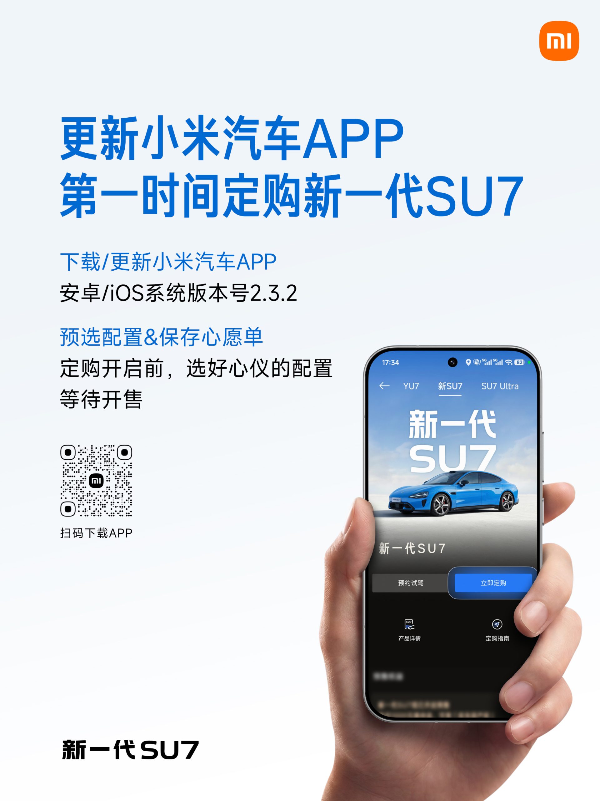 新一代SU7,今晚7点见。 小订今晚7点截止,小订用户可享锁单优先排产, 提车送价值699元的智能双表盘。 您可提前更新小米汽车APP,第一时间定购新一代SU7。 感谢各位的支持,今晚见! #小米新一代SU7今日发布#