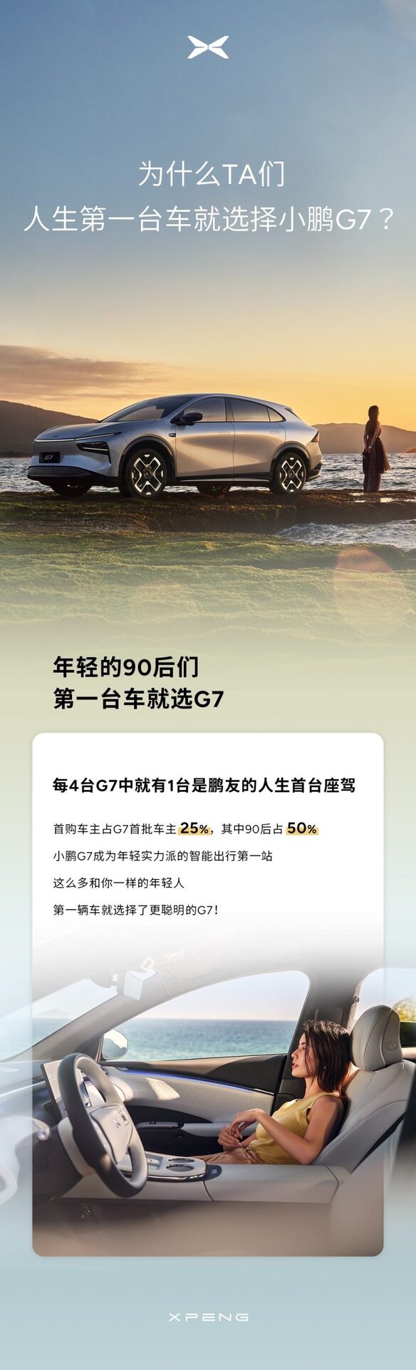 每4台G7里,就有1台是鹏友的人生首购座驾!首购车主中,90后占比占50%,这群懂生活、追品位的职场er,都把小鹏G7列入「人生第一台车最优解」!