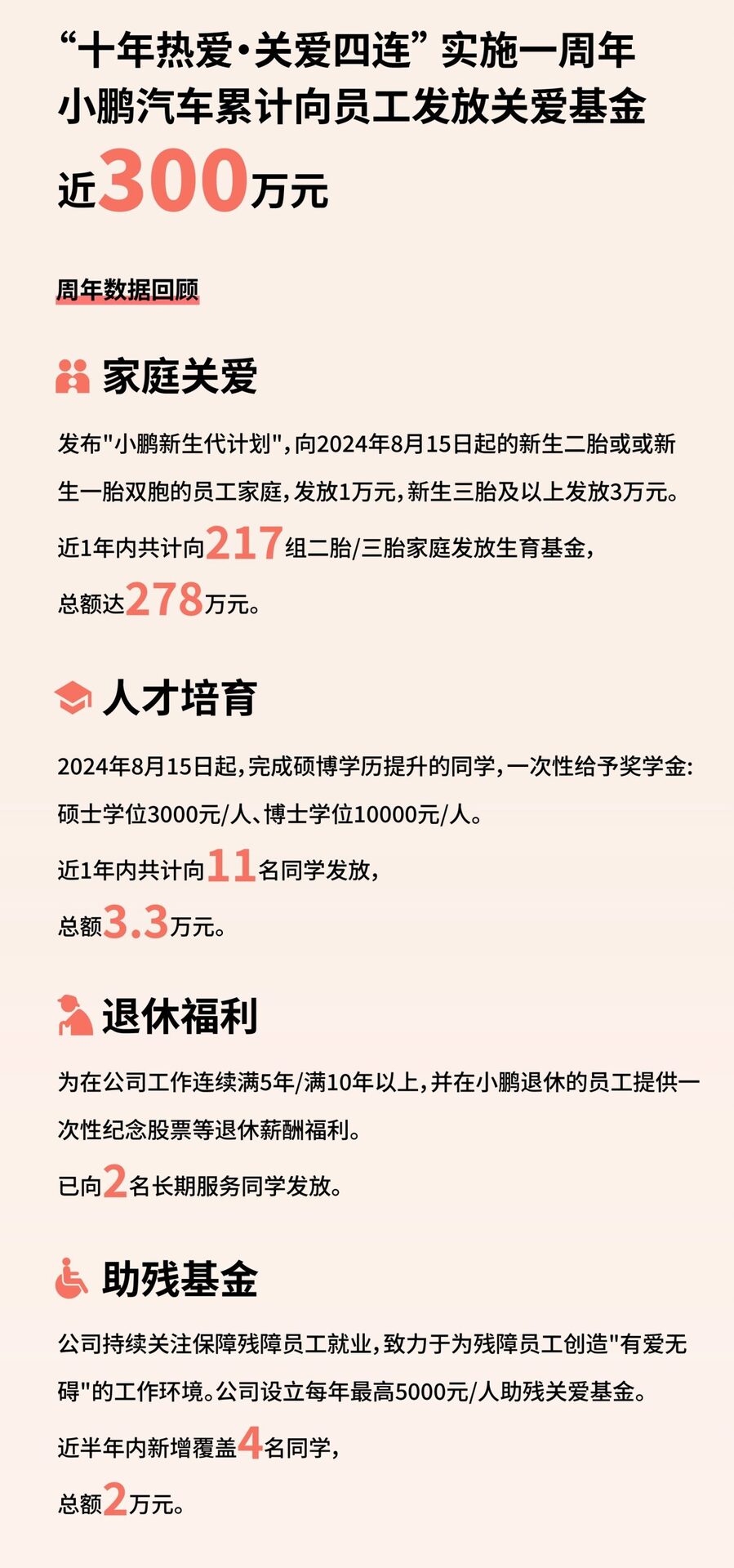 “十年热爱·关爱四连”实施一周年,小鹏汽车累计向员工发放关爱基金近300万元! 未来,小鹏将持续深化“关爱四连”计划,探索更多能给予员工关爱的场景,敬请期待!