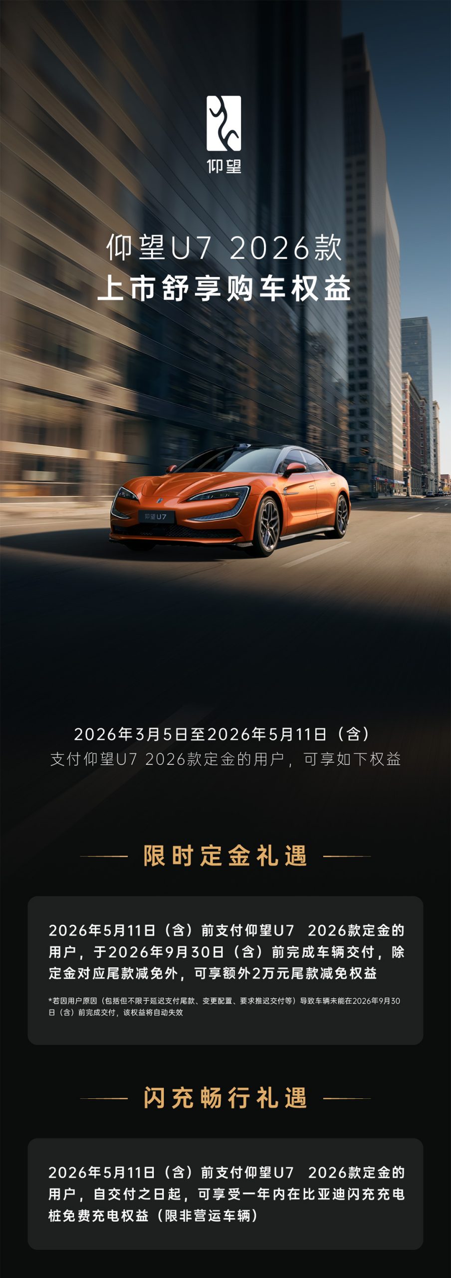 #新款仰望U7# 现已上市,65.8万元起! 5月11日前下定,舒享上市购车权益。 -至高40000元增换购礼遇 -20000元限时定金礼献 -7年低息特惠金融方案 -1年不限里程免费闪充补能权益 #仰望U7四电机续航破1000# #仰望汽车26款闪充焕新升级# #比亚迪第二代刀片电池##比亚迪闪充中国战略#