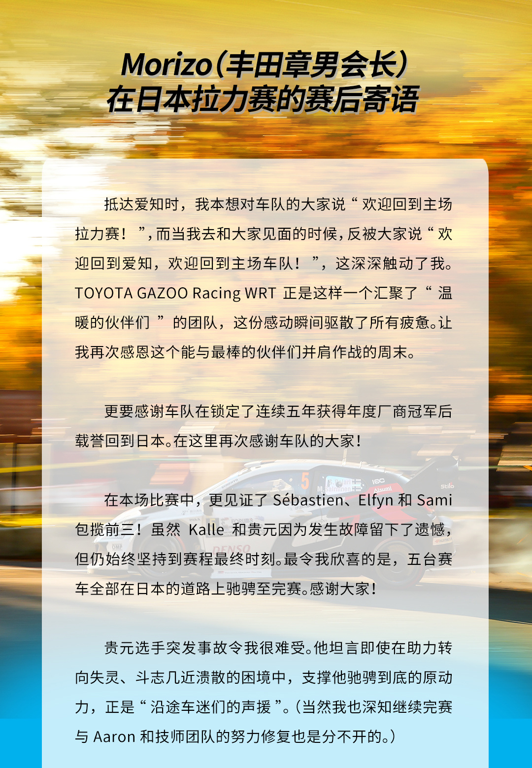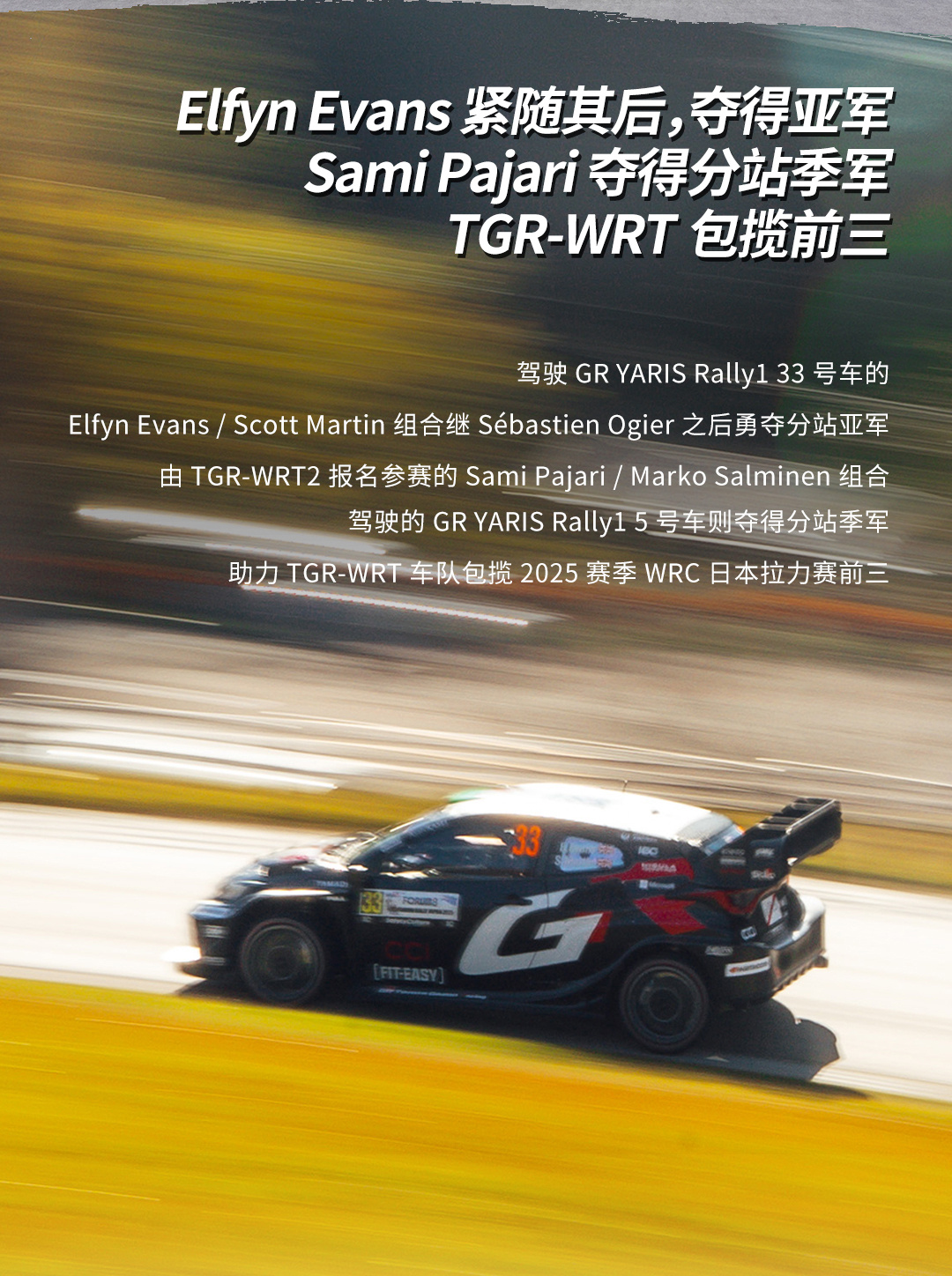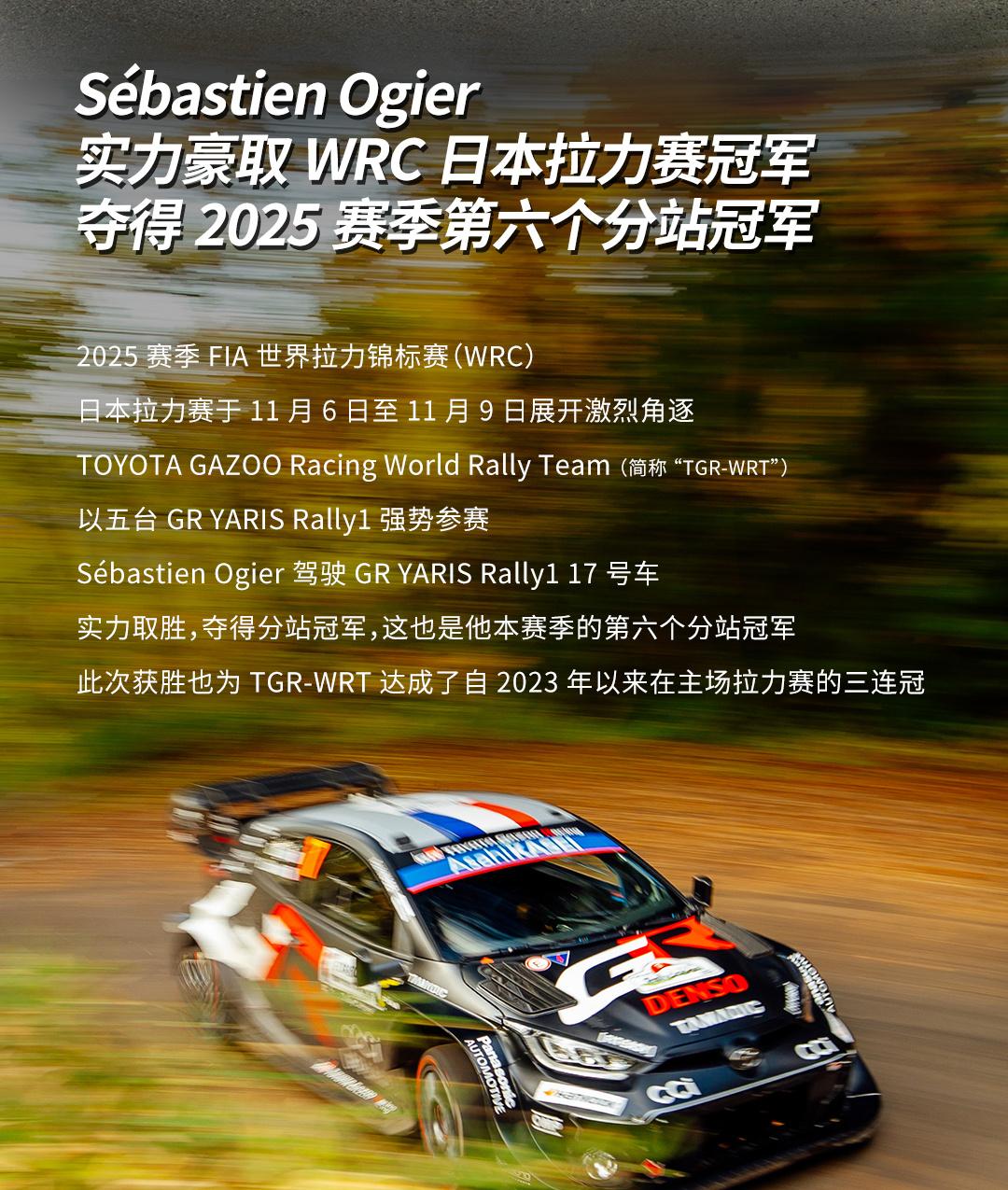 2025赛季 #FIA世界拉力锦标赛##WRC##日本拉力赛# 于11月6日至11月9日展开激烈角逐。 #TOYOTA GAZOO Racing World Rally Team# 以五台 #GR YARIS Rally1# 强势参赛,包揽前三!Sébastien Ogier驾驶GR YARIS Rally1 17号车实力取胜,夺得分站冠军,此次获胜也为车队达成了自2023年以来在主场拉力赛的三连